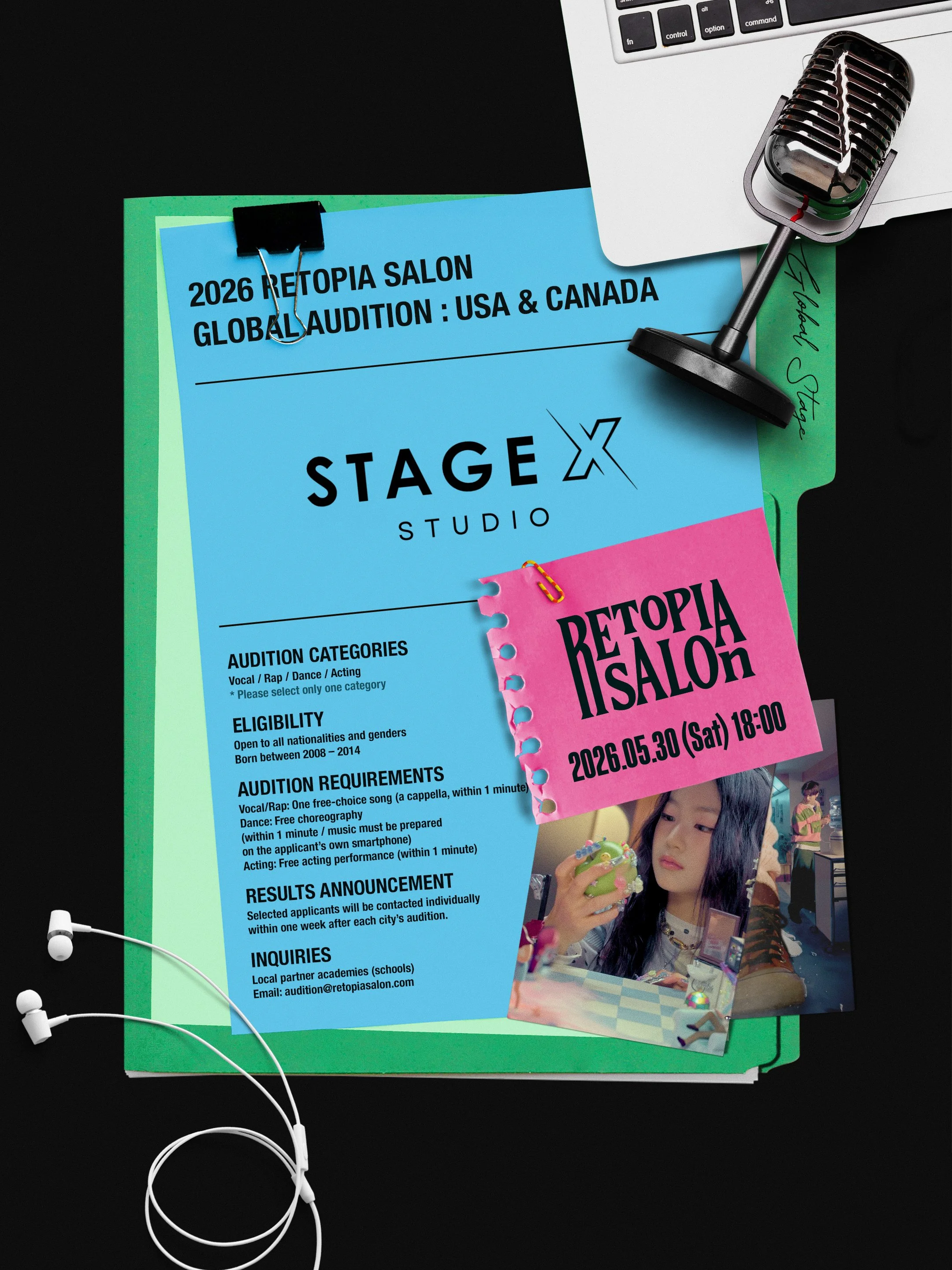Selected applicants will be contacted individually within one week after STAGE X STUDIO’s in-person audition. Do not contact STAGE X STUDIO or Retopia Salon regarding the results of your audition.